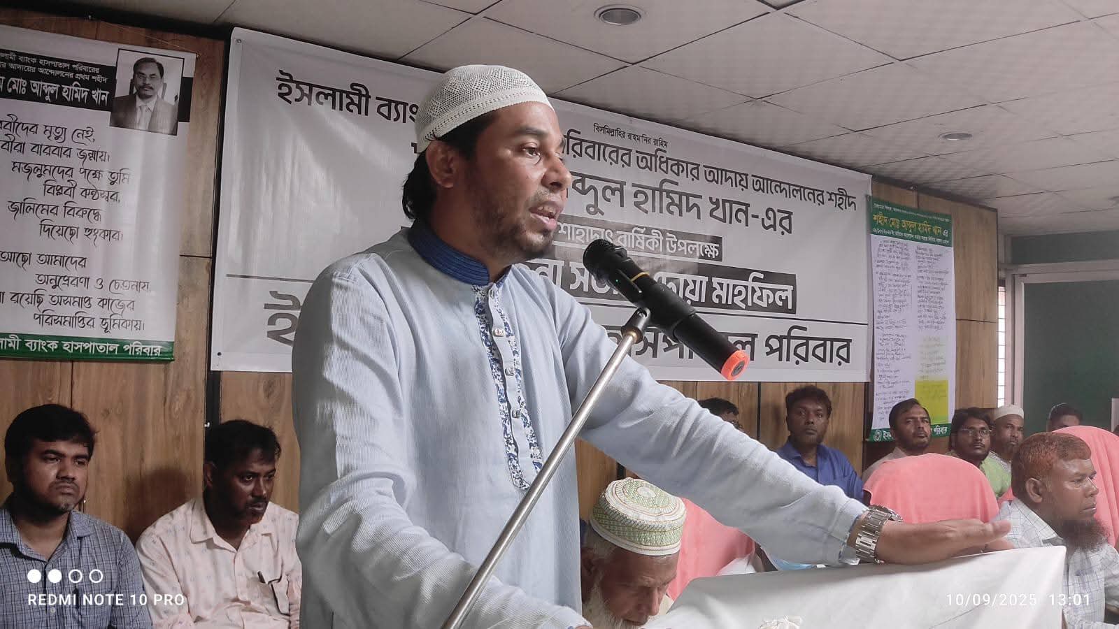 ঢাকা : ইসলামী ব্যাংক হাসপাতাল পরিবারের অধিকার আদায় আন্দোলনের শহীদ মরহুম আব্দুল হামিদ খান-এর ১ম শাহাদাৎ বার্ষিকী উপলক্ষে আলোচনা সভা
